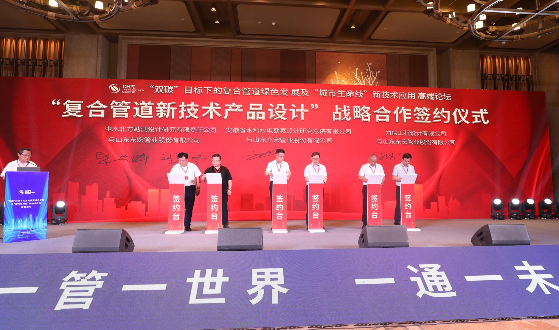 在8位業(yè)內(nèi)領(lǐng)軍專家的精彩分享之后,本次論壇進(jìn)入成果轉(zhuǎn)化環(huán)節(jié),多家領(lǐng)域內(nèi)代表性設(shè)計(jì)院和頭部企業(yè)與東宏股份進(jìn)行了“復(fù)合管道新技術(shù)產(chǎn)品設(shè)計(jì)”戰(zhàn)略合作簽約儀式和“復(fù)合管道新技術(shù)產(chǎn)品應(yīng)用”戰(zhàn)略合作簽約儀式。
